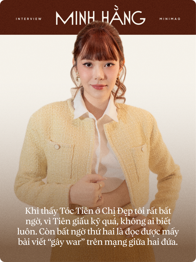 Không phải tham gia Chị Đẹp thì Minh Hằng và Tóc Tiên mới bị so sánh đâu, mà từ lúc nhỏ cả hai đã được mọi người nói giống nhau rồi. Lúc đó tôi với Tóc Tiên cũng tròn tròn, trán cũng cao cao nên nhìn vào mọi người tưởng 2 chị em. Thế nên khi vào Chị Đẹp và đọc những bình luận dự đoán Minh Hằng và Tóc Tiên yêu thương hay đấu đá thì hai đứa thấy có chút mắc cười.