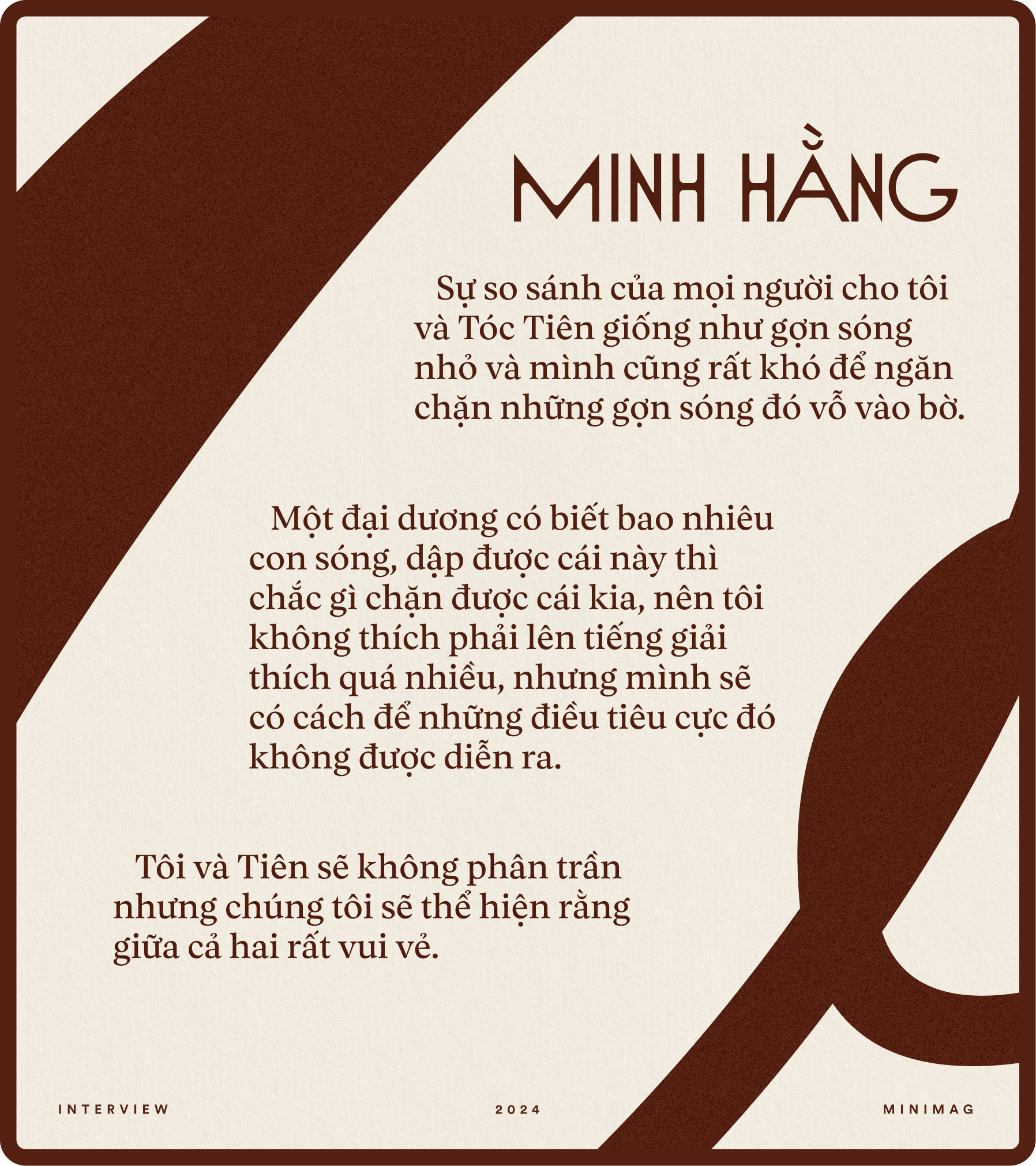 Thật ra ở phía sau sân khấu ít ai biết được giữa mọi người rất bình thường với nhau. Sự so sánh của mọi người cho tôi và Tóc Tiên giống như gợn sóng nhỏ và mình cũng rất khó để ngăn chặn những gợn sóng đó vỗ vào bờ. Một đại dương có biết bao nhiêu con sóng, dập được cái này thì chắc gì chặn được cái kia, nên tôi không thích phải lên tiếng giải thích quá nhiều, nhưng mình sẽ có cách để những điều tiêu cực đó không được diễn ra.