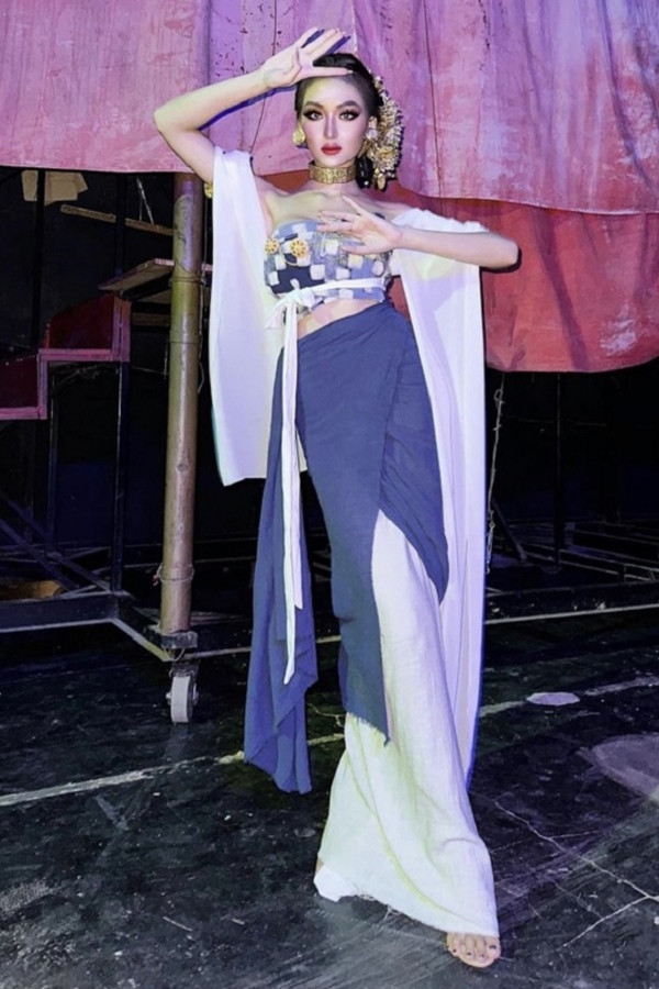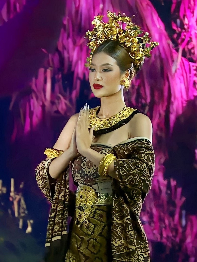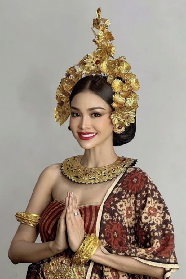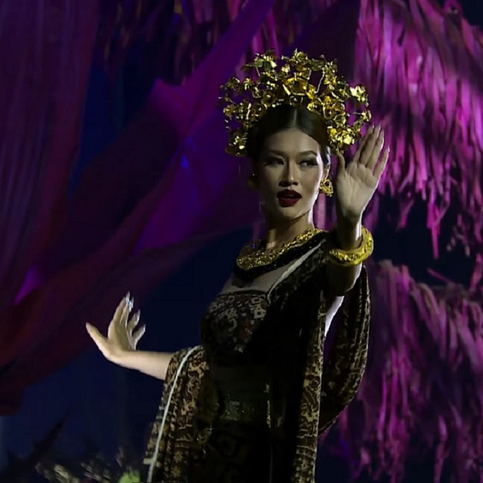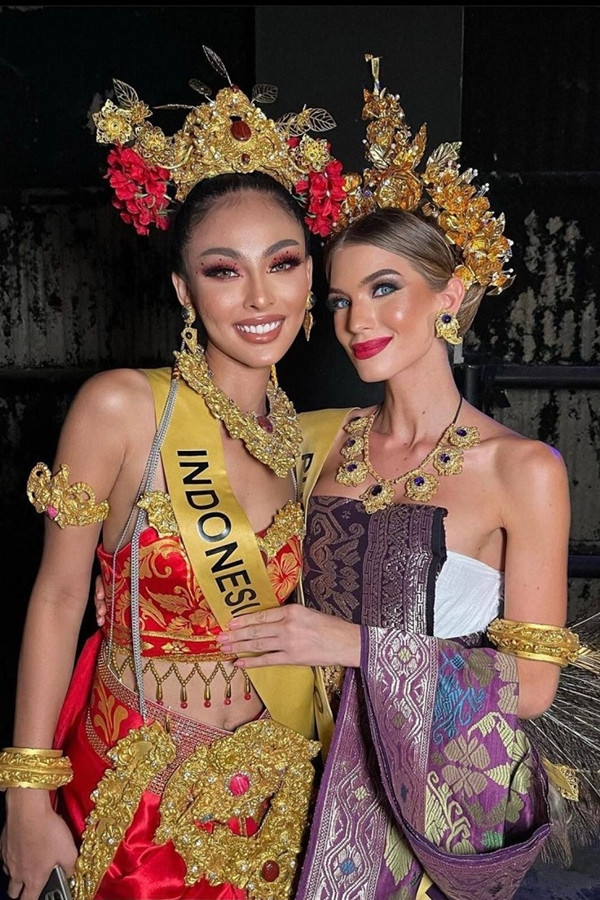 Kết thúc phần thi trang phục truyền thống Indonesia, đương kim Hoa hậu Hòa bình Quốc tế 2021 – Nguyễn Thúc Thùy Tiên xuất hiện. Người đẹp diện bộ cánh có tông màu đỏ và vàng là chủ đạo, các hoa văn được thêu dệt tinh tế, phần mũ được chạm khắc thủ công hoành tráng. Màn trình diễn của Thùy Tiên gây ấn tượng với khán giả, điệu bộ tay chân uyển chuyển, linh hoạt.