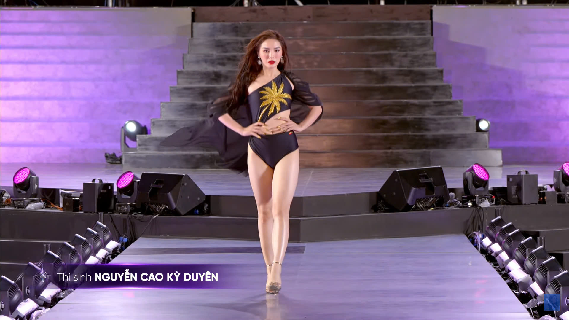 Cuối đêm thi là phần trình diễn áo tắm, những mẫu bikini nóng bỏng giúp tôn lên đường cong quyến rũ của dàn thí sinh. Nhiều người đẹp nổi bật với thần thái rạng rỡ, sự tự tin trong ánh mắt, nụ cười và bước catwalk điêu luyện.