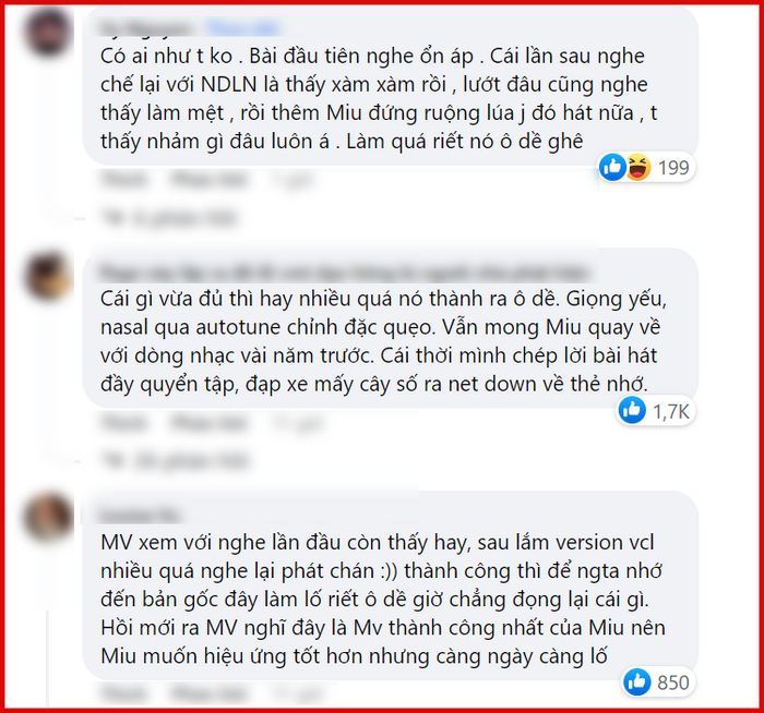 Dưới đoạn clip, ngoài những bình luận khen ngợi cho sự sáng tạo và không ngừng làm mới bản thân cũng như âm nhạc của Miu Lê thì cũng xuất hiện không ít những luồng ý kiến thẳng thừng chỉ trích việc Miu Lê đang bào mòn chính ca khúc từng được khán giả rất yêu mến của mình.