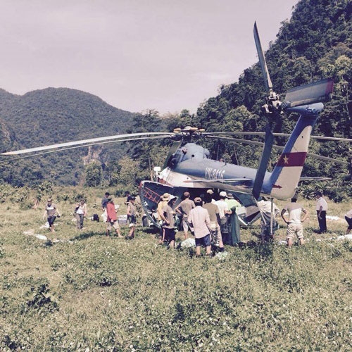 | Máy bay trực thăng đưa các đạo cụ quay phim đến Quảng Bình. |