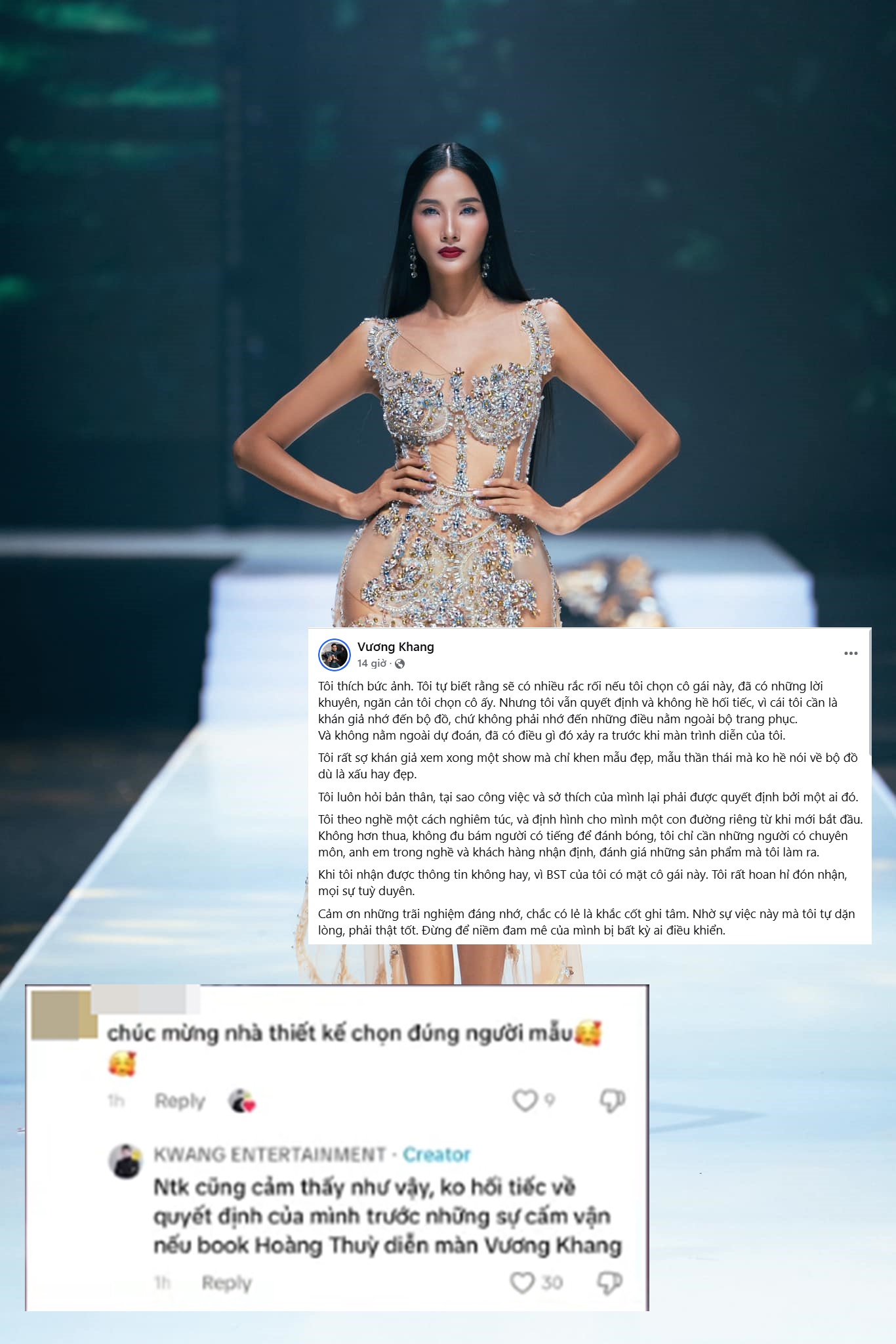 Mới đây, NTK Vương Khang khiến cộng đồng mạng xôn xao khi có chia sẻ liên quan đến Á hậu Hoàng Thùy. NTK này nói rằng, khi lựa chọn Hoàng Thùy diễn vị trí quan trọng trong show diễn của mình, anh sẽ gặp nhiều rắc rối vì đã có lời cảnh báo, ngăn cản trước đó.
