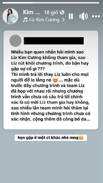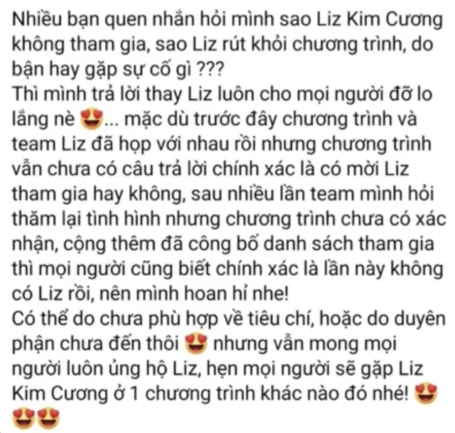 Nhiều bạn quen nhắn hỏi mình sao Liz Kim Cương không tham gia, sao Liz rút khỏi chương trình, do bận hay gặp sự cố gì?