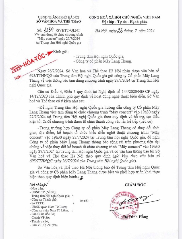 Tuy nhiên, ngày 26/7, Sở Văn hóa & Thể thao Hà Nội đã nhận được văn bản của Trung tâm Hội nghị Quốc gia về việc tạm dừng tổ chức đêm nhạc nói trên. Trong văn bản cũng đề nghị đơn vị chọn một ngày khác tổ chức, công bố đến các phương tiện truyền thông đại chúng cũng như gửi báo cáo về phía Sở Văn hóa & Thể thao Hà Nội.