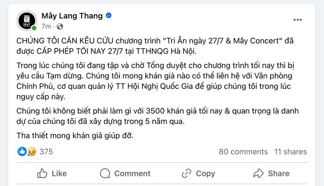 Sau khi nhận được văn bản từ Sở Văn hóa & Thể thao Hà Nội, đơn vị này đã có bài chia sẻ “kêu cứu" khán giả. Phía đơn vị cho biết: “Chúng tôi đang tập và chờ tổng duyệt cho chương trình tối nay thì bị yêu cầu tạm dừng…. Chúng tôi không biết làm gì với 3.500 khán giả tối nay & quan trọng là danh dự chúng tôi xây dựng trong 5 năm qua”.