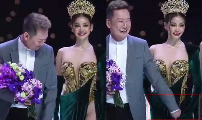 Chủ tịch Miss Grand ngượng ngùng trước ống kính và mất khoảng nhiều giây để quyết định đưa tay che chắn cho phần "da thịt" bị hở của "gà cưng". Khoảnh khắc ông Nawat "giải cứu" Hoa hậu Hòa bình xứ Chùa Vàng đã thu về nhiều lời khen ngợi.