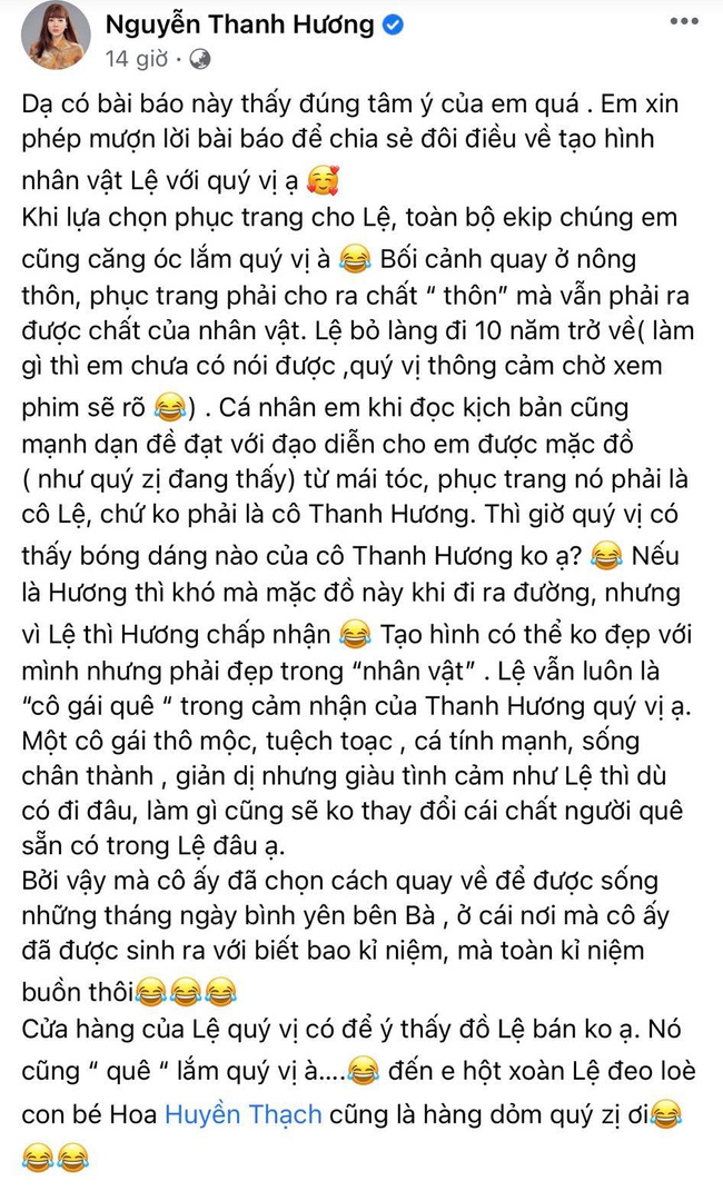 Mới đây, trên trang cá nhân, nữ chính Mùa hoa tìm lại Thanh Hương đã lý giải cho những điều mà nhiều khán giả thắc mắc thời gian gần đây về "gu" thời trang của Lệ trong phim.