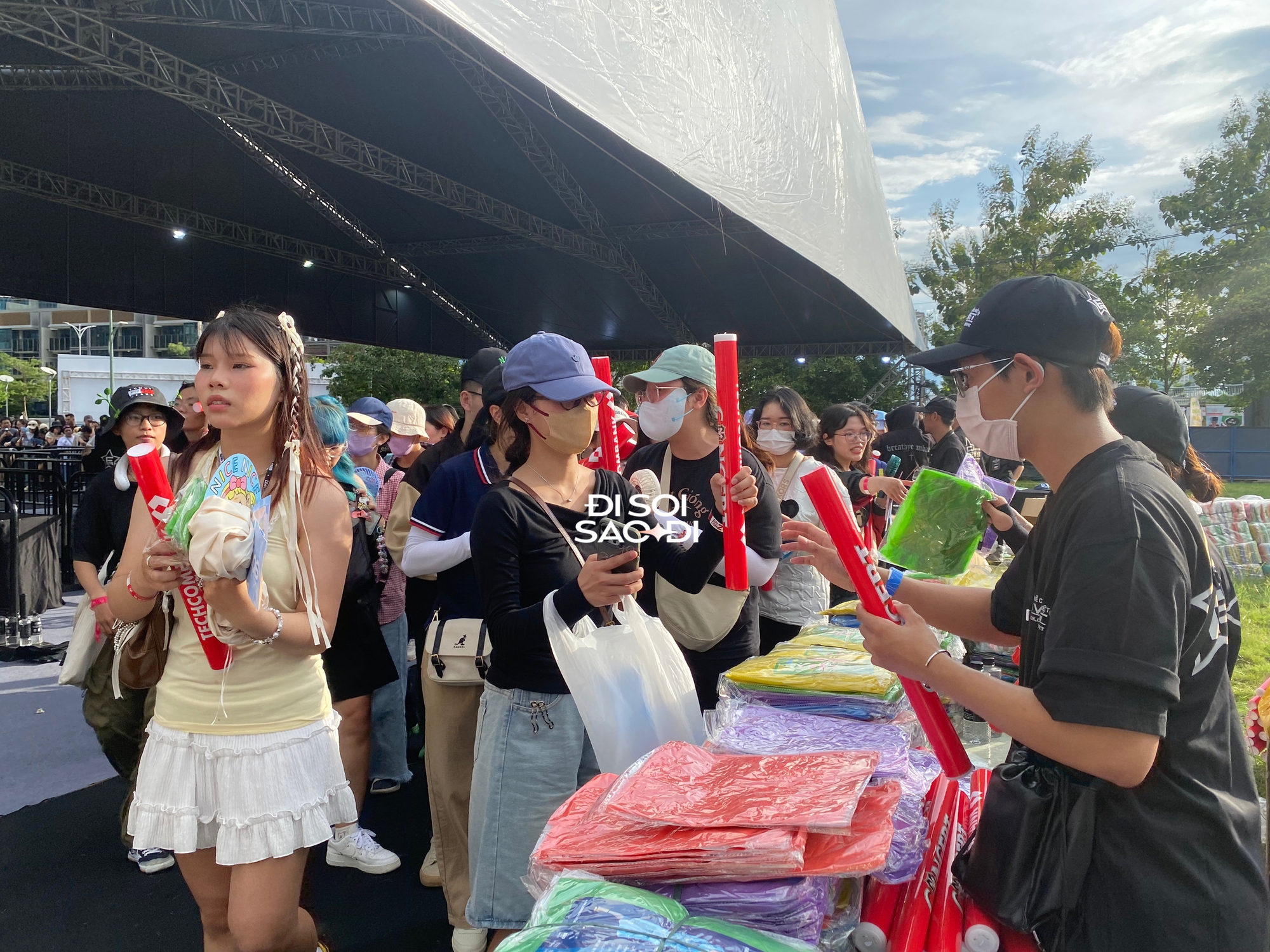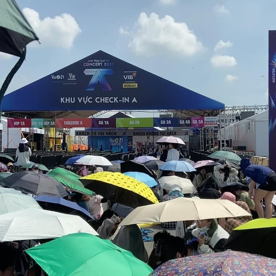 Càng gần đến giờ G, khu vực check-in càng đông. Thời tiết nắng nóng là một trở ngại, nhưng không phải vấn đề quá lớn. Đã có kinh nghiệm đu concert từ đêm 1, các fan Say Hi muốn "xí" chỗ đẹp tại concert đều đến tập trung trước hơn nửa ngày. Thậm chí, có người còn... cắm trại từ 5 giờ sáng.