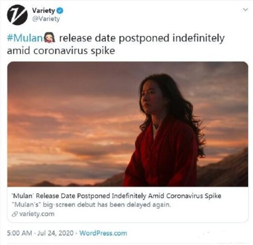 Phim điện ảnh Mulan (Hoa Mộc Lan) do Lưu Diệc Phi đảm nhận vai chính vừa thay đổi lịch công chiếu lần thứ 4. Ở lần điều chỉnh thứ 3, khi tình hình dịch bệnh Covid-19 vẫn diễn biến nghiêm trong, Mulan đã rời lịch công chiếu đến ngày 21 tháng 8.