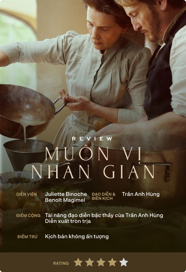 Một điểm khác tạo nên sự hấp dẫn của Muôn Vị Nhân Gian là tay nghề bậc thầy của nhà làm phim gốc Việt Trần Anh Hùng. Tác phẩm cũng giúp ông đoạt giải Đạo diễn xuất sắc nhất tại LHP Cannes 2023. Dự án cũng nhận về cơn mưa lời khen từ giới phê bình quốc tế, đạt điểm tươi 97% trên trang Rotten Tomatoes.