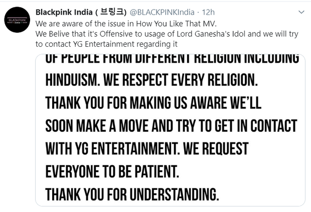 Sau khi phát hiện ra chi tiết này trong MV "How You Like That", người hâm mộ tại Ấn Độ bắt đầu trend hashtag #Ganesha và #YGapologise, qua đó yêu cầu công ty có hành động sửa chữa cảnh quay này trong MV "How You Like That". Fan còn làm rõ rằng họ không đổ lỗi cho Lisa và chỉ muốn YG phản hồi cũng như xin lỗi. Tuy nhiên cho tới thời điểm này công ty vẫn chưa lên tiếng về sự việc nói trên.
