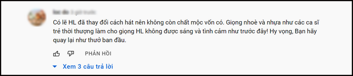 Cụ thể, một khán giả đã để lại bình luận bên dưới MV: "Có lẽ Hoài Lâm đã thay đổi cách hát nên không còn chất mộc vốn có. Giọng nhoè và nhựa như các ca sĩ trẻ thời thượng làm cho giọng Hoài Lâm không được sáng và tình cảm như trước đây! Hy vọng bạn hãy quay lại như thuở ban đầu."