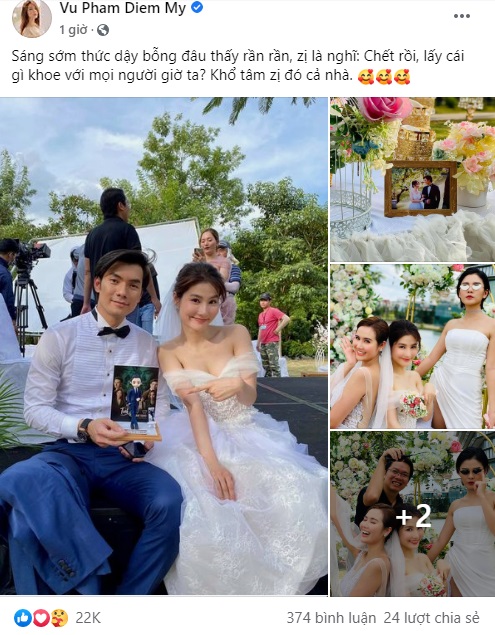 Không chỉ thành viên của ekip, mà cả Diễm My cũng liên tục cập nhật hình ảnh về đám cưới được fan chờ đợi nhất trong Tình yêu và tham vọng. Cách vài giờ nữ diễn viên lại 'nhá hàng' ảnh cưới cho thấy độ háo hức không thua kém gì các fan. Trong loạt ảnh được Diễm My đăng tải, một vài bức ảnh hậu trường đã cho thấy mối quan hệ khá vui vẻ, thân thiết của cô và bạn diễn Nhan Phúc Vinh, dẹp tan tin đồn 'bằng mặt nhưng không bằng lòng' râm ran suốt 6 tháng phim phát sóng.