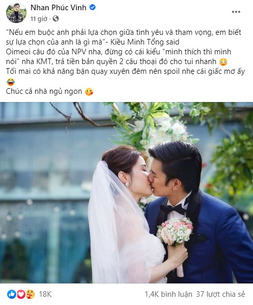 Tuy nhiên, đáng chú ý là động thái mới nhất của Nhan Phúc Vinh khi anh chàng đã chịu đăng ảnh bạn diễn Diễm My 9x. Đặc biệt đó là khoảnh khắc khóa môi ngọt ngào của hai nhân vật Minh - Linh khiến fan phát cuồng.