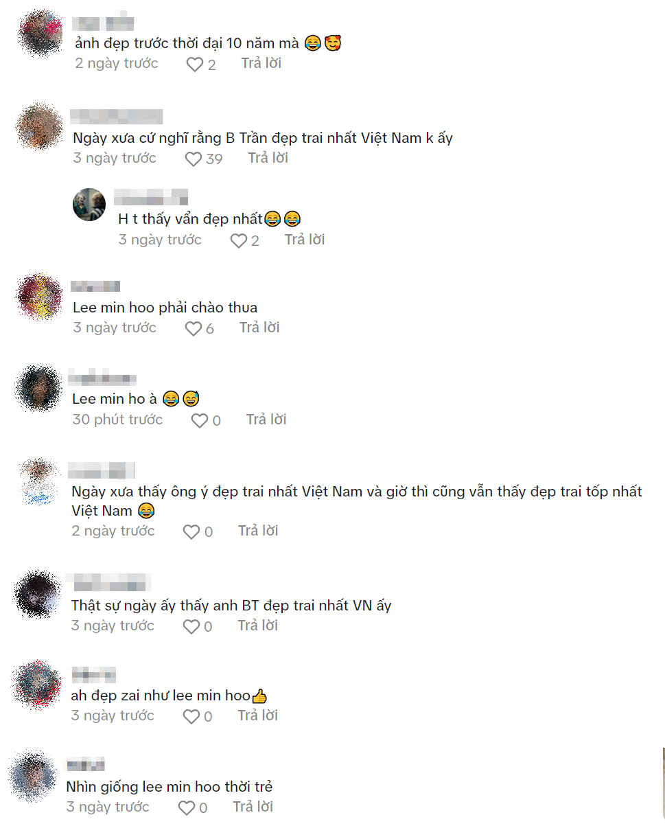 Dưới phần bình luận, không ít cư dân mạng dành lời khen cho diện mạo của anh. "Phan lãng tử đẹp trai nhất Việt Nam", "Anh đẹp trước thời đại 10 năm"; "Trông như Lee Min Ho thời trẻ" (Lee Min Ho từng nổi tiếng với mái tóc xoăn thời Vườn Sao Băng),... là những bình luận nổi bật nhất. Nhiều người nhắc đến từ khóa "đẹp trai nhất Việt Nam" hay dấu mốc 10 năm trước là bởi trong quá khứ, B Trần cực kỳ nổi tiếng với vai Phan lãng tử ở sitcom 5S Online. Thời điểm đóng bộ phim này, nhan sắc nổi bật của B Trần khiến anh được yêu thích hơn bao giờ hết, từ khóa "đẹp trai nhất Việt Nam" cũng theo anh từ đó cho đến hiện tại.