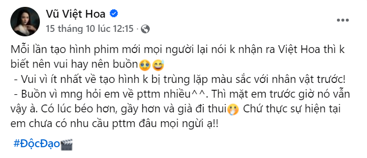 Bên cạnh những lời khen, Việt Hoa lại bị một số cư dân mạng hoài nghi rằng có can thiệp dao kéo nên mới có được dáng vẻ quyến rũ, gương mặt thon gọn trong dự án lần này. Đứng trước nghi án này, Việt Hoa mới đây đã có phản hồi chính thức trên Facebook cá nhân. Cô khẳng định mình thỉnh thoảng đổi khác chỉ vì "béo hơn, gầy hơn và già đi" chứ chưa có nhu cầu phẫu thuật.