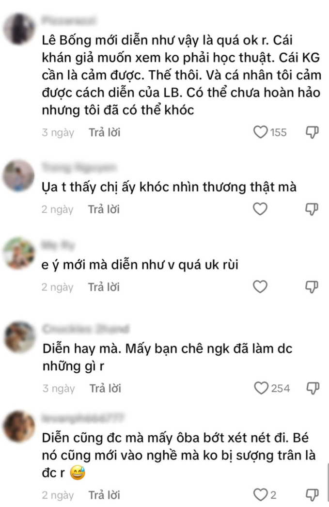Tuy nhiên bên cạnh những bình luận chê bai thì cũng có nhiều người bênh vực Lê Bống, cho rằng diễn xuất của cô không hề tệ, thậm chí cảnh khóc này còn gây xúc động cho người xem. Những khán giả này cũng giữ vững quan điểm rằng với một người mới như Lê Bống, diễn chỉ cần không quá sượng là có thể chấp nhận được, không nên xét nét, chê bai nhiều.