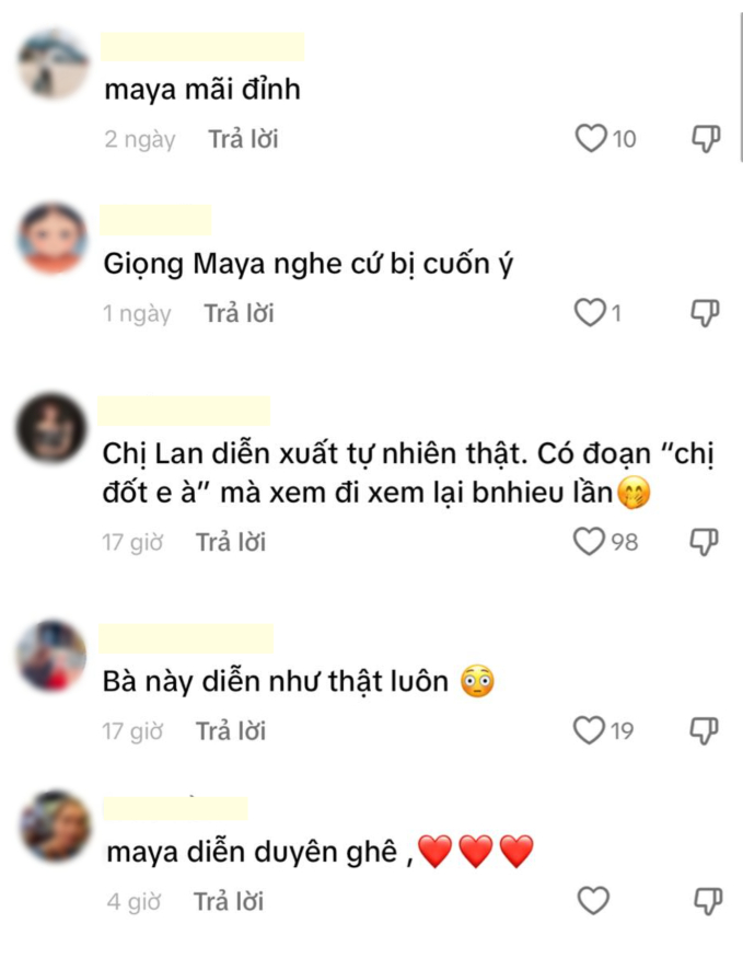Sở dĩ nhân vật Lan được chú ý là bởi diễn xuất vô cùng ấn tượng của Maya. Trên các nền tảng MXH của VTV, khán giả để lại vô số bình luận khen ngợi từ dáng vẻ quyến rũ đến diễn xuất ấn tượng, giọng thoại thật sự lôi cuốn của nữ diễn viên.