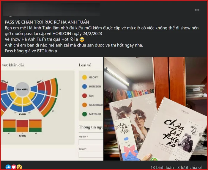 Tuy nhiên, thời gian gần đây, thông tin vé concert của Hà Anh Tuấn đang bị rao bán rầm rộ trên mạng xã hội, thu hút nhiều sự quan tâm từ khán giả. Theo đó, nhiều hạng vé trong đêm concert này đã được rao bán với giá bằng giá gốc hoặc chênh lệch khoảng nửa triệu đồng/vé nhưng không nhận được nhiều sự quan tâm. Riêng những bài đăng sang nhượng với giá rẻ hơn giá gốc thì dễ dàng "bán chạy" hơn các mức giá còn lại.