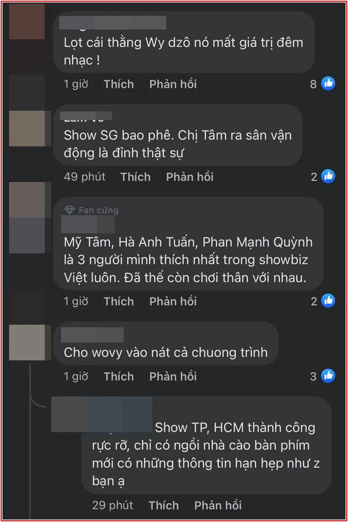 Trong khi đó, nhiều khán giả đã bày tỏ thái độ từ thất vọng cho đến phản đối về việc Wowy góp mặt trong đêm liveshow của Mỹ Tâm. Gần đây, Wowy ngồi ghế cố vấn chương trình Ca sĩ mặt nạ nhưng không được lòng người xem, kết quả vị trí của anh trong chương trình đã bị thay thế.
