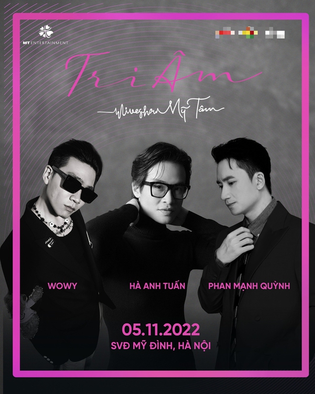 Tối 4/10, Mỹ Tâm cũng chính thức xác nhận 3 nghệ sĩ khách mời sẽ đồng hành cùng cô tại liveshow Tri Âm Hà Nội: Hà Anh Tuấn, Phan Mạnh Quỳnh và Wowy. Đây cũng là 3 nghệ sĩ khách mời đã từng biểu diễn tại liveshow Tri Âm TP.HCM cách đây hơn 1 năm.