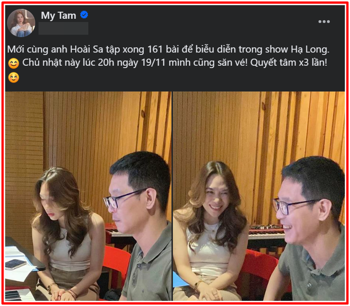 Trên trang cá nhân, mới đây Mỹ Tâm đã đăng tải 2 bức ảnh ghi lại khoảnh khắc nữ ca sĩ cùng nhạc sĩ Hoài Sa có mặt tại phòng làm nhạc, chăm chỉ làm việc để chuẩn bị cho đêm nhạc MY SOUL 1981 được diễn ra tại Hạ Long vào ngày 9/12 sắp tới.