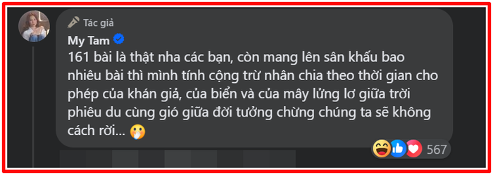 Tuy nhiên, khi thấy fan phản ứng khá mạnh mẽ trước chia sẻ trên, Mỹ Tâm liền để lại bình luận lý giải: "161 bài là thật nha các bạn, còn mang lên sân khấu bao nhiêu bài thì mình tính cộng trừ nhân chia theo thời gian cho phép của khán giả, của biển và của mây lửng lơ giữa trời phiêu du cùng gió giữa đời tưởng chừng chúng ta sẽ không cách rời…"