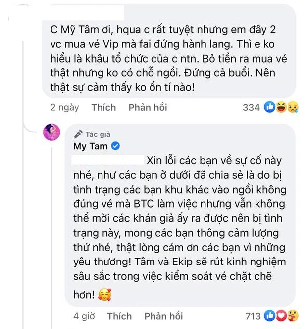 Một tài khoản để lại bình luận: “Chị Mỹ Tâm ơi, hôm qua chị rất tuyệt nhưng em đây 2 vợ chồng mua vé VIP mà phải đứng hành lang thì em không hiểu khâu tổ chức của chị như thế nào. Bỏ tiền ra mua vé thật nhưng không có chỗ ngồi, đứng cả buổi nên cảm thấy không ổn tí nào”.