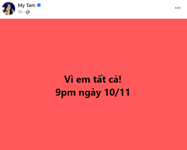 Mới đây trên trang fanpage chính thức, Mỹ Tâm đã hé lộ sản phẩm mới khi cập nhật dòng trạng thái: 'Vì em tất cả! 9pm ngày 10/11'.