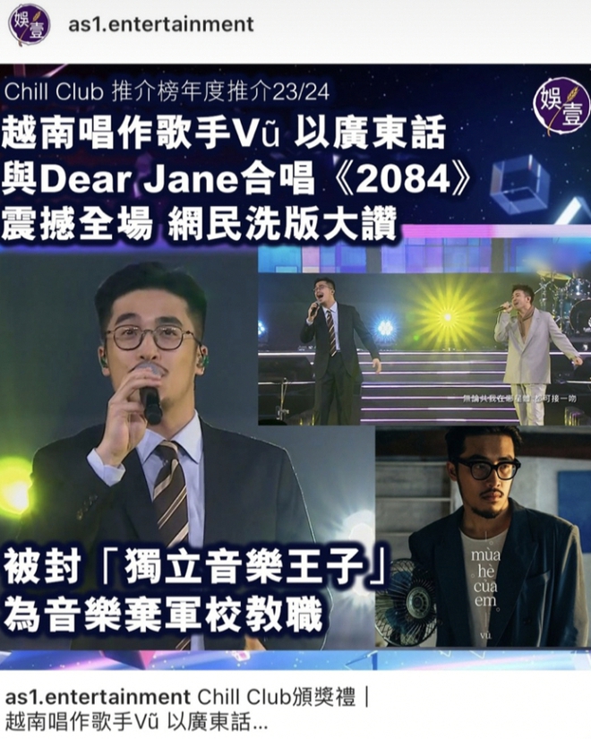 Mới đây, Vũ. đã tham dự một lễ trao giải ở Hong Kong (Trung Quốc) và có tiết mục song ca với ban nhạc nội địa Dear Jane bản hit của chính mình là Những lời hứa bỏ quên. Đặc biệt, Tim - thành viên của Dear Jane đã bất ngờ hát bằng tiếng Việt.