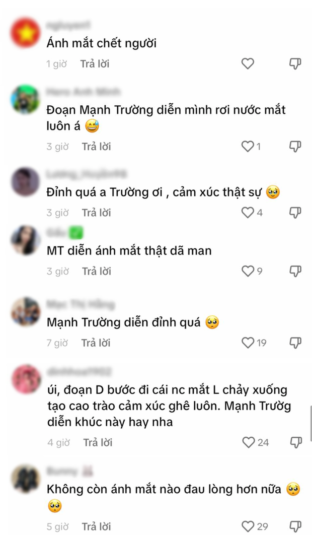 Khán giả dành vô số lời khen cho Mạnh Trường bởi lối diễn xuất bằng ánh mắt quá xuất sắc trong cảnh phim này. Nhiều người thậm chí còn khóc theo nam diễn viên khi xem cảnh tượng chia tay muộn màng đầy đau lòng. Vốn dĩ Mạnh Trường là một nam diễn viên thực lực, giỏi nhất trong việc đóng những bộ phim tình cảm. Có lẽ sau cảnh phim này, khán giả sẽ có thiện cảm hơn và chấp nhận bỏ qua yếu tố ngoại hình để mở lòng với Lâm phiên bản trưởng thành.