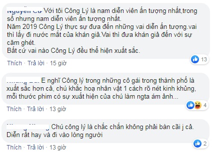 Tuy nhiên, trên mạng xã hội nhiều khán giả bày tỏ sự ủng hộ cho NSƯT Công Lý. Vừa qua, NSƯT Công Lý đã hoàn thành xuất sắc vai diễn Lâm 'đồ tể' trong phim Những cô gái trong thành phố. Màn hóa thân đỉnh cao của Công Lý đã khắc họa chân thực một Lâm 'đồ tể' hành nghề đòi nợ thuê nhưng khiến khán giả nhiều lần phải rơi nước mắt cho số phận của nhân vật.