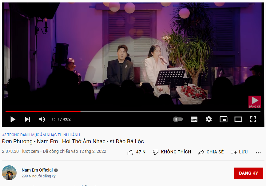 Mới đây, cộng đồng mạng vô cùng thích thú trước video Nam Em cover bài hát Đơn Phương của nam ca sĩ Đào Bá Lộc. Bằng giọng hát nội lực, ngọt ngào, da diết của mình, cô nàng gây dấu ấn mạnh mẽ trong lòng người hâm mộ. Video ngay lập tức nhận được sự hưởng ứng nhiệt tình, thu về gần 3 triệu lượt xem cùng hơn 4 ngàn bình luận chỉ sau vài ngày ra mắt.