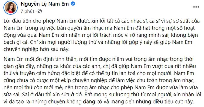 Người đẹp viết: "Lời đầu tiên cho phép Nam Em được xin lỗi tất cả các nhạc sĩ, ca sĩ vì sự sơ suất của Nam Em trong sự việc bản quyền âm nhạc mà Nam Em đã hát trong một số hoạt động vừa qua. Nam Em xin nhận mọi lời trách móc vì rõ ràng mình sai, không biện bạch gì cả. Chỉ xin mọi người lượng thứ và những lời góp ý này sẽ giúp Nam Em chuyên nghiệp hơn sau này.