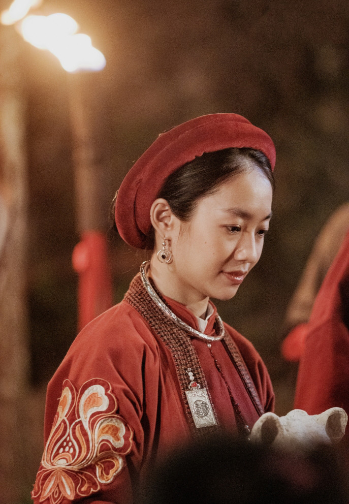 “Cảnh đám cưới này cũng là cảnh quay đầu tiên mà cả cả ê-kíp cùng thực hiện trong một đêm mưa lạnh trên núi đá ở Hà Giang. Đây là một cảnh khó trên một địa hình khó, mọi người rất dễ trượt chân ngã, tôi run nhưng vẫn cố gắng nghiêm túc và tập trung hết khả năng”, cô chia sẻ.