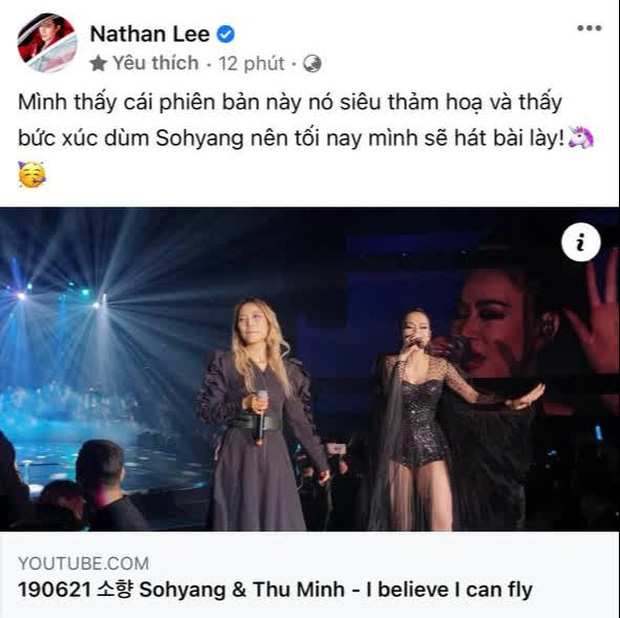 Mới đây, Nathan Lee lại khiến dân tình "dậy sóng" khi chia sẻ lại màn trình diễn của Thu Minh cùng So Hyang trong showcase của nữ ca sĩ. Anh thẳng thắn nhận xét rằng tiết mục này "siêu thảm họa". Ngoài ra, giọng ca Không Quan Tâm còn bày tỏ sự bức xúc cho Diva Hàn Quốc Sohyang và hứa hẹn trong tối nay sẽ thể hiện lại bài hát này trong buổi livestream của mình.