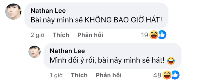 Bên dưới phần bình luận, anh thẳng thắn cho biết sẽ không bao giờ để Hương Tràm tiếp tục thể hiện bản hit đình đám. Nam ca sĩ cũng khẳng định chắc nịch rằng "bài này mình sẽ không bao giờ hát" thế nhưng lại nhanh chóng đổi ý.