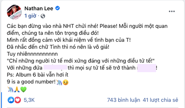 Trước những ý kiến chỉ trích trái chiều đó, Nathan Lee cũng có lời chia sẻ trên trang cá nhân. Ngay đầu dòng trạng thái, nam ca sĩ đã phải dùng đến từ "Please" (Làm ơn) để nhắn gửi cộng đồng mạng dừng việc chỉ trích nhạc sĩ Nguyễn Hồng Thuận. Anh cho biết: "Mỗi người một quan điểm, chúng ta nên tôn trọng điều đó. Mình rất đồng cảm với khái niệm về tình bạn của T".