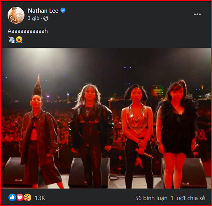 Không chỉ Tóc Tiên, mới đây nam ca sĩ Nathan Lee cũng đã đăng tải bức ảnh của bốn thành viên 2NE1 quy tụ cùng nhau trên sân khấu âm nhạc này, kèm theo đó là dòng trạng thái kéo dài: "Aaaaaaa". Có thể thấy, Nathan Lee hiện tại chỉ muốn thét lên thật to vì hạnh phúc trước màn hội ngộ của nhóm nhạc "huyền thoại" 2NE1.