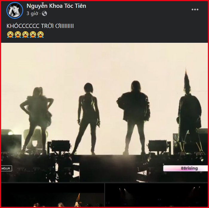 Theo đó, trên trang Facebook cá nhân của mình, "fan cứng" Tóc Tiên đã chia sẻ lại bài viết ghi lại màn trình diễn của 2NE1 cũng dòng trạng thái: "KHÓCCCCCC TRỜI ƠIIIIIIIII". Có thể thấy, không chỉ người hâm mộ trên toàn thế giới, mà Tóc Tiên cũng không thể giấu được cảm xúc hạnh phúc đến bật mức bật khóc của mình khi nhìn thấy bốn thành viên 2NE1 tái hợp cùng nhau trên sân khấu tại Coachella