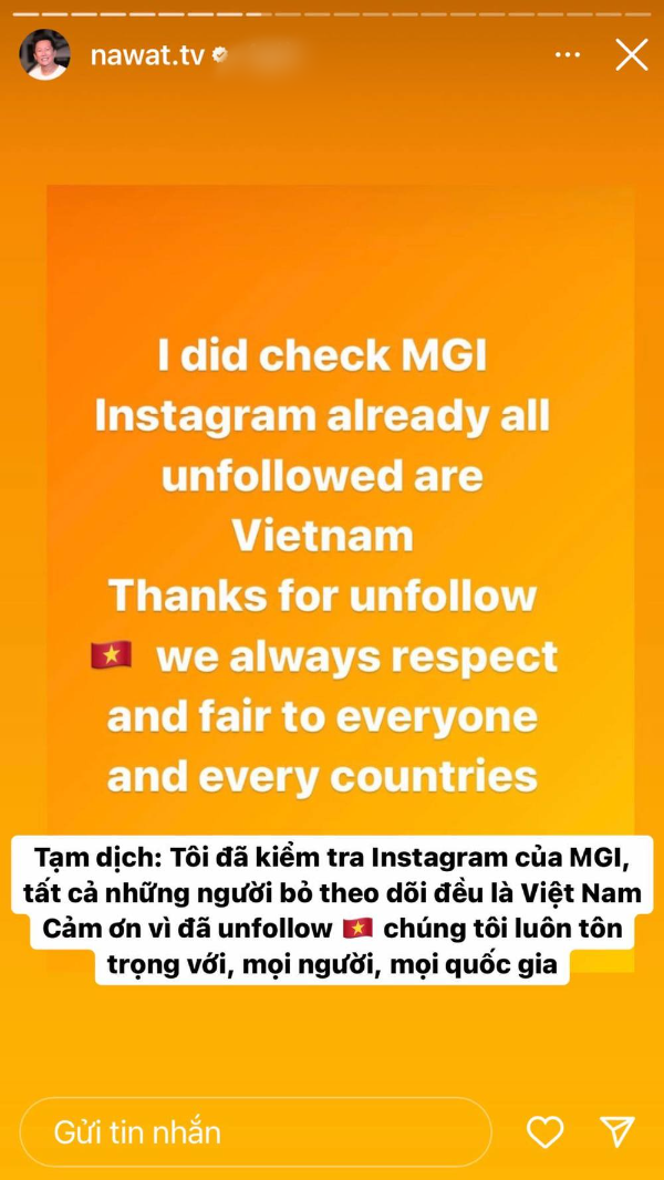 Tuy nhiên, khi lượng theo dõi bị giảm 2 triệu lượt chỉ ít giờ sau đêm chung kết, ông Nawat đã lên tiếng: "Tôi đã kiểm tra tài khoản Instagram của Miss Grand International (MGI), tất cả lượt bỏ theo dõi đều từ Việt Nam. Cảm ơn đã hủy theo dõi. Chúng tôi luôn tôn trọng và công bằng với mọi người và mọi quốc gia".