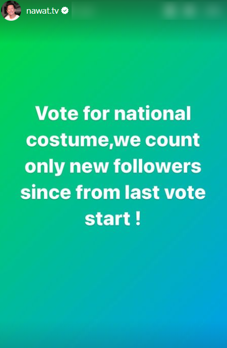 Cụ thể, ông Nawat đã đăng tải thể lệ bình chọn mới cho phần thi "Best National Costume" trên trang cá nhân. Theo đó, ban tổ chức chỉ tính điểm bình chọn hợp lệ cho những tài khoản mới theo dõi trên trang chủ Miss Grand International. Điều này khiến netizen không khỏi ngỡ ngàng bởi hiện tại Hoa hậu Thiên Ân đang vượt mặt đại diện Thái Lan về lượt like bình chọn.