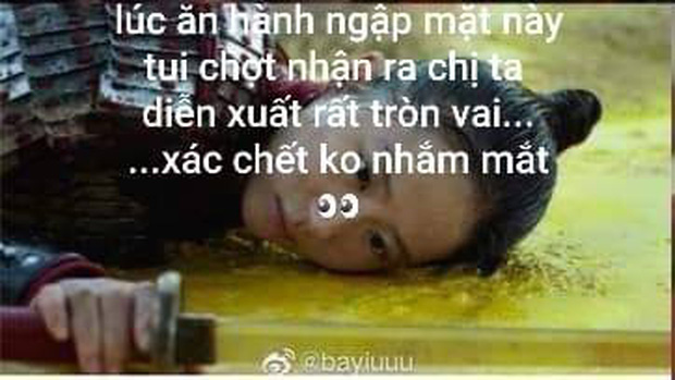 Đáng nói nhất trong thời gian gần đây chính là diễn xuất gây xôn xao của nữ chính Lưu Diệc Phi. Xuyên suốt phim, "thần tiên tỷ tỷ" của làng phim Hoa ngữ chẳng có nhiều nét biểu cảm gì mấy. Gương mặt cô gần như "bất biến" giữa cuộc đời mặc cho có bao nhiêu biến cố xảy ra. Vì quá tức cười với phần trình diễn "trước sau như một" của nữ diễn viên, cư dân mạng Việt đã nhanh tay chế ra loạt ảnh "đáng ăn tiền" để phô diễn nhiều cung bậc cảm xúc "không hề giả trân" của minh tinh xứ tỉ dân.