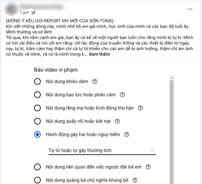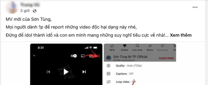 “Các bố mẹ cùng mình report MV mới ra của Sơn Tùng M-TP. Clip không phù hợp với giới trẻ.