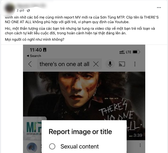 Sáng 29/4, trên mạng xã hội xuất hiện hàng trăm bài đăng kêu gọi báo cáo (report) bài hát mới của ca sĩ Sơn Tùng M-TP vì có nội dung gây hại hoặc nguy hiểm, cụ thể là hành vi tự tử hoặc tự gây thương tích. Các bài đăng này thu về lượng tương tác lớn trên Facebook.