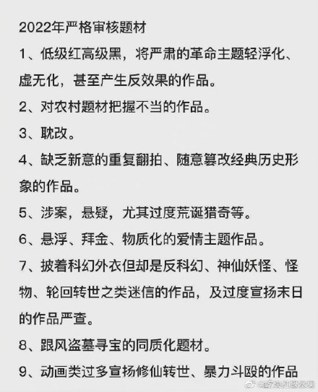 Sáng nay (13/1), trên Weibo xuất hiện một danh sách với thông tin điểm danh những phần nội dung phim Trung sẽ bị kiểm duyệt gắt gao (tức gần như bị cấm) trong năm 2022.