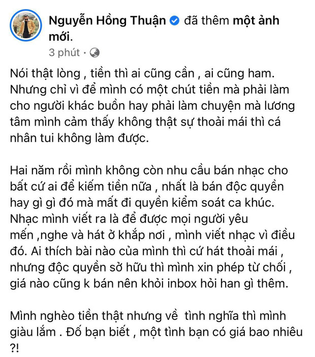 Không chỉ vậy, khi nhạc sĩ Khắc Việt lên tiếng rằng "Vấn đề của tôi không phải là tiền, mà phải là nhiều tiền" khi Nathan Lee "chốt đơn" 2 bản hit Yêu Thương Quay Về và Bình Yên Nhé của Cao Thái Sơn. Nguyễn Hồng thuận lại cho biết: "Giá nào cũng không bán nên khỏi inbox hỏi han gì thêm. Mình nghèo tiền thật nhưng về tình nghĩa thì mình giàu lắm. Đố bạn biết, 1 tình bạn có giá bao nhiêu".
