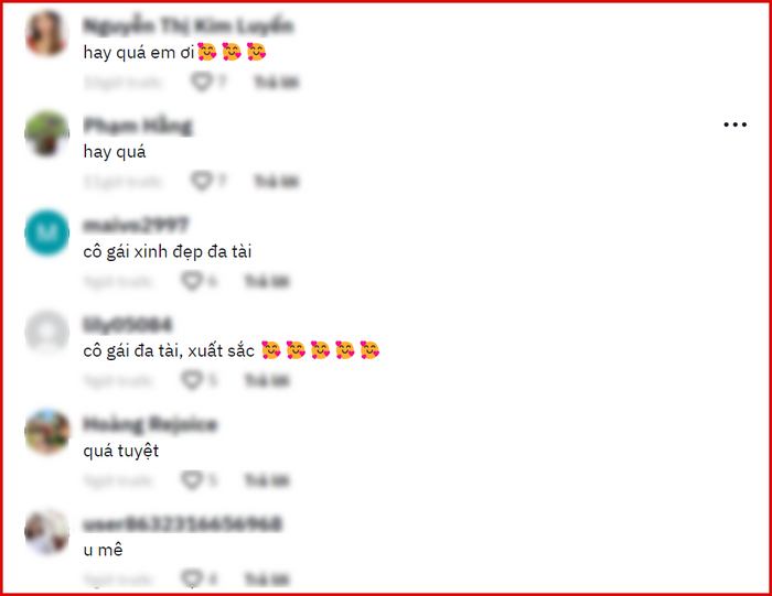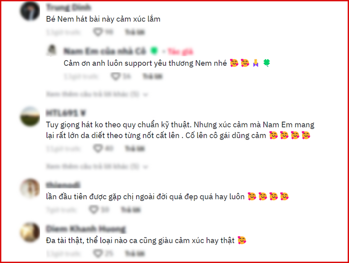 Bên dưới đoạn clip, cư dân mạng không ngừng để lại nhiều bình luận khen ngợi giọng hát của Nam Em khi thể hiện ca khúc Bolero này. Đồng thời, hi vọng Nam Em sẽ có nhiều bước tiến hơn trong âm nhạc.