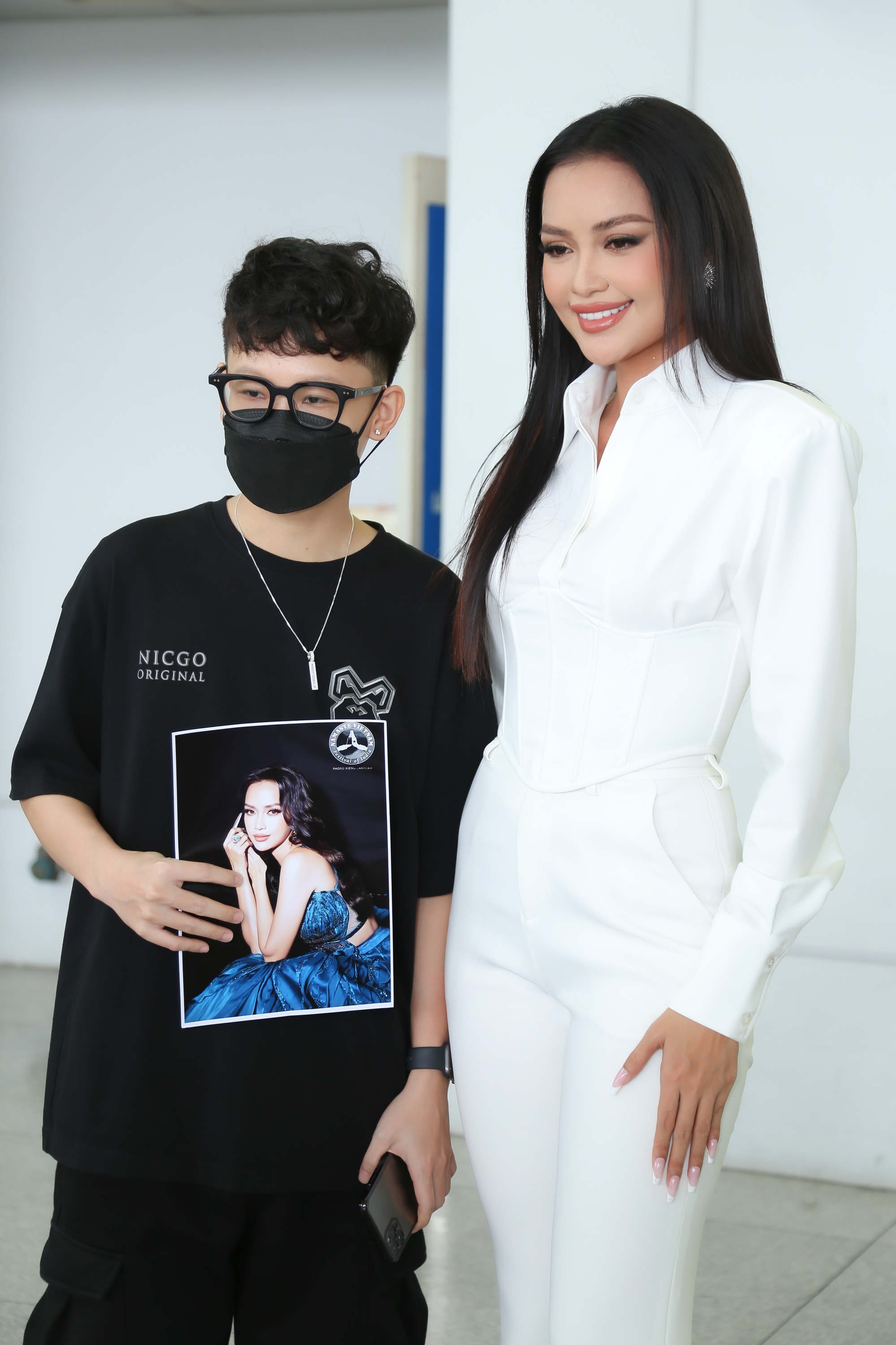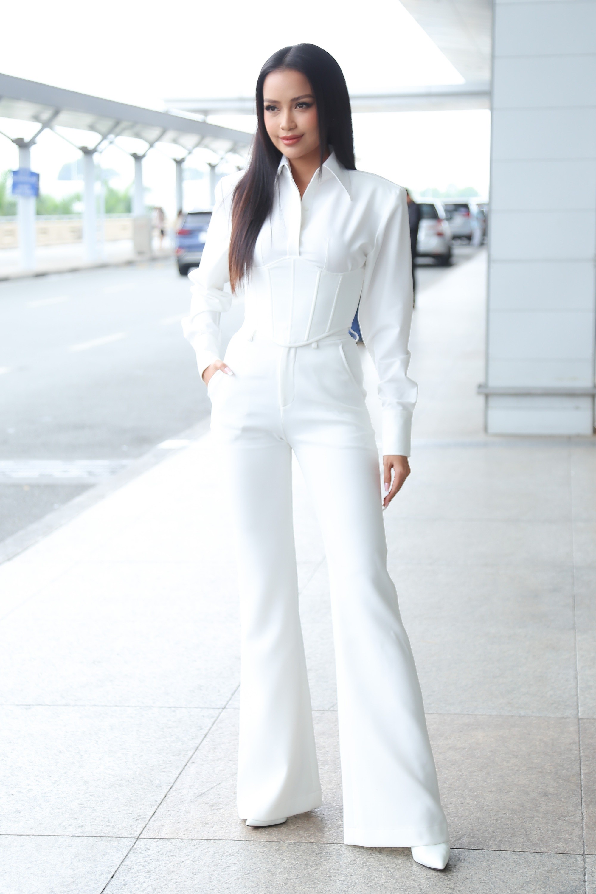 Tại sân bay, mỹ nhân sinh năm 1994 diện set đồ trắng thanh lịch, tạo điểm nhấn với chi tiết corset độc đáo ở eo. Nàng hậu chọn kiểu tóc ép thẳng dài và layout make up tông Tây sắc sảo. Dù không diện váy áo lộng lẫy hay sử dụng vương miện, người đẹp gốc Tây Ninh cũng toát lên hào quang của một beauty queen chính hiệu.